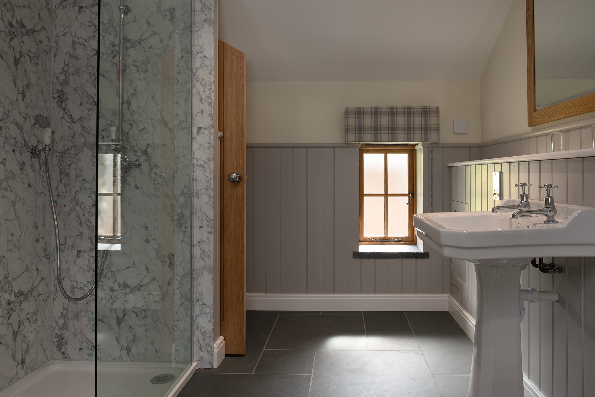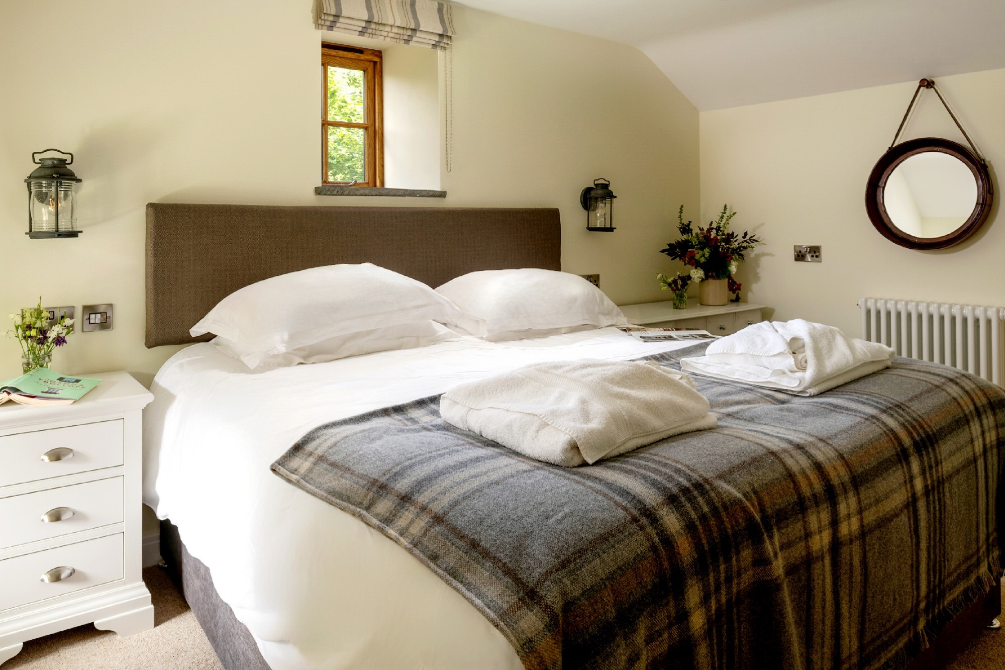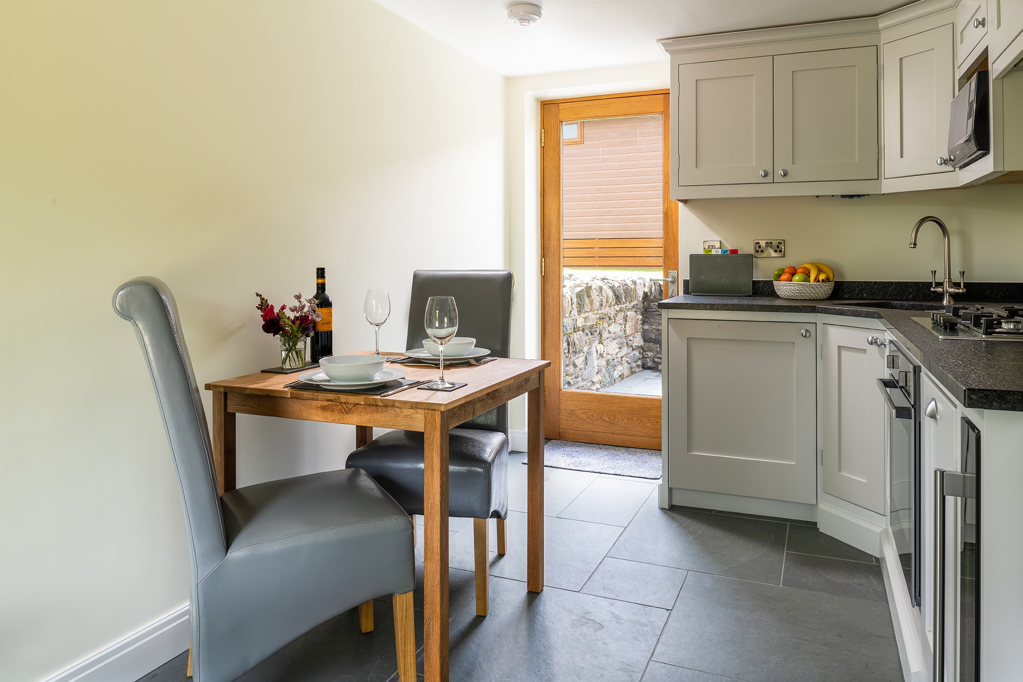 A glazed front door opens into an open-plan ground-floor living area. Oak windows and doors allow light to stream in while framing captivating woodland views. A wood effect stove enhances the cosiness of the lounge, making it the perfect place to watch your favourite film, read a book, or plan your holiday adventures. The stylish kitchen features high-end appliances and a dining table that is ideal for a hearty breakfast or a romantic dinner. A glazed door to the rear of the cottage leads to a furnished slate-paved courtyard where you can dine alfresco while admiring the view.