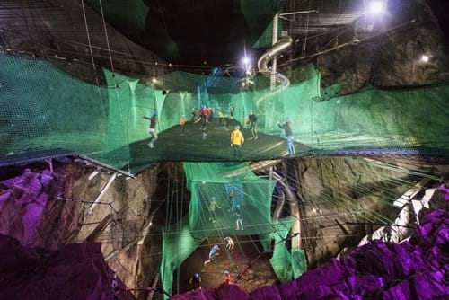 At Llechwedd you can experience Bounce Below, where large nets are suspended within cavern chambers, Zip World Caverns, an underground zipline and rope course set within old mine tunnels, and Underground Golf, an 18-hole mini golf course beneath the surface. There is also a Deep Mine Tour for those interested in the history of slate quarrying in the area.