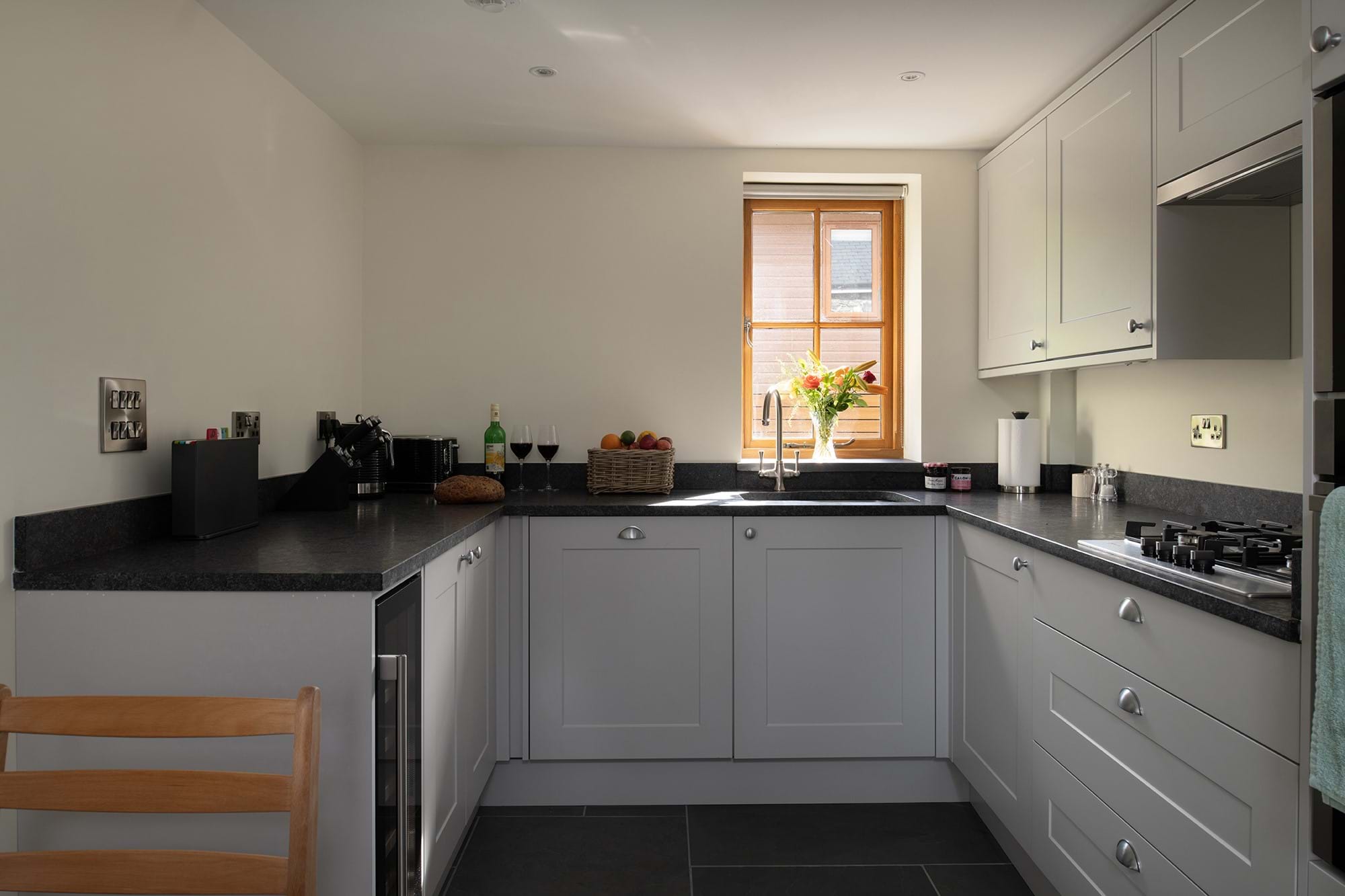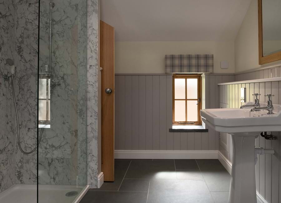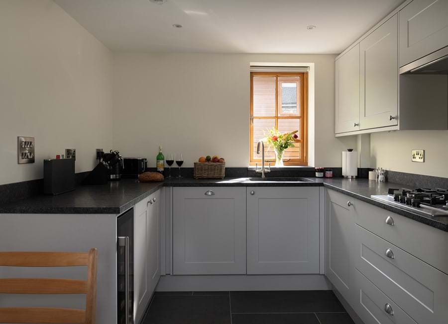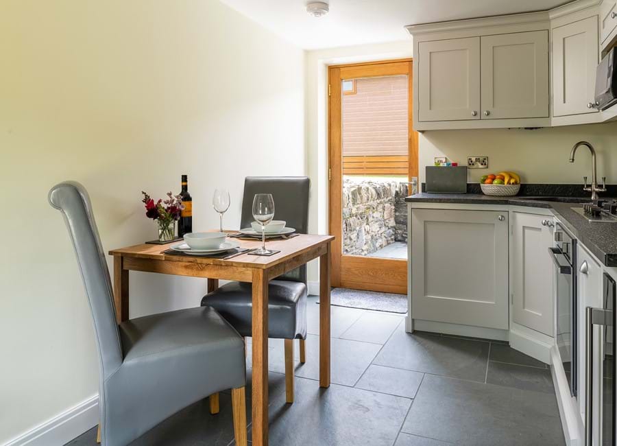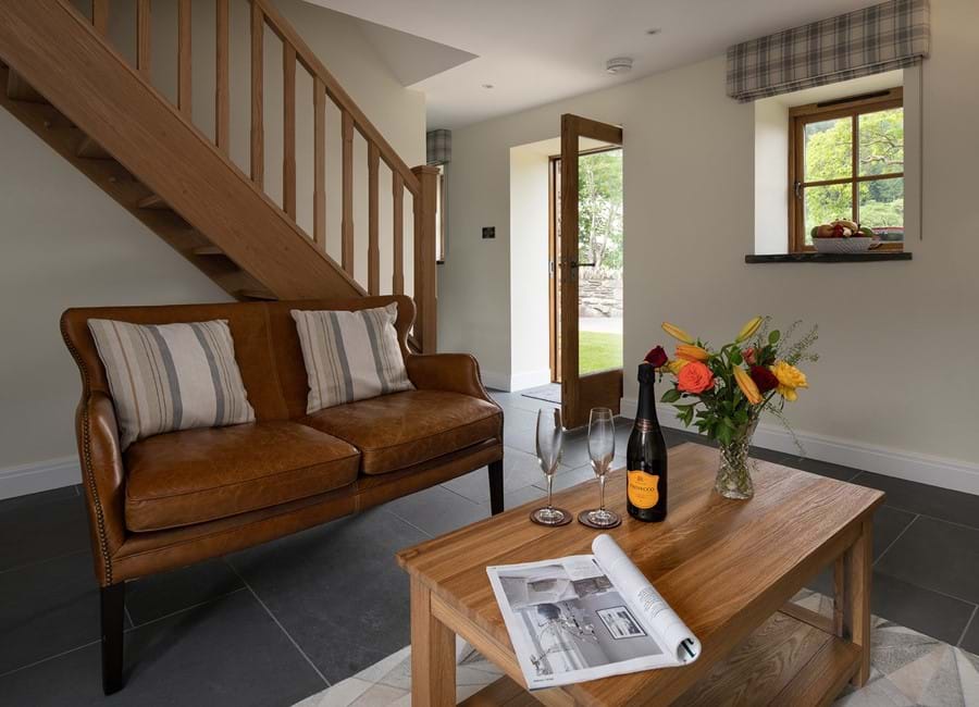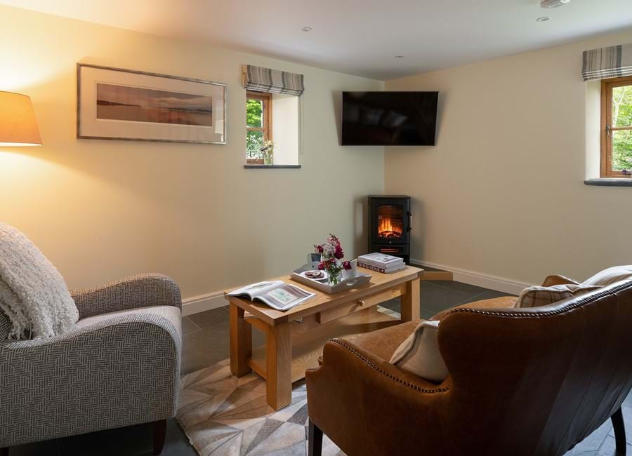 A glazed front door opens into an open-plan ground-floor living area. Oak windows and doors allow light to stream in while framing captivating woodland views. A wood effect stove enhances the cosiness of the lounge, making it the perfect place to watch your favourite film, read a book, or plan your holiday adventures. The stylish kitchen features high-end appliances and a dining table that is ideal for a hearty breakfast or a romantic dinner. A glazed door to the rear of the cottage leads to a furnished slate-paved courtyard where you can dine alfresco while admiring the view.