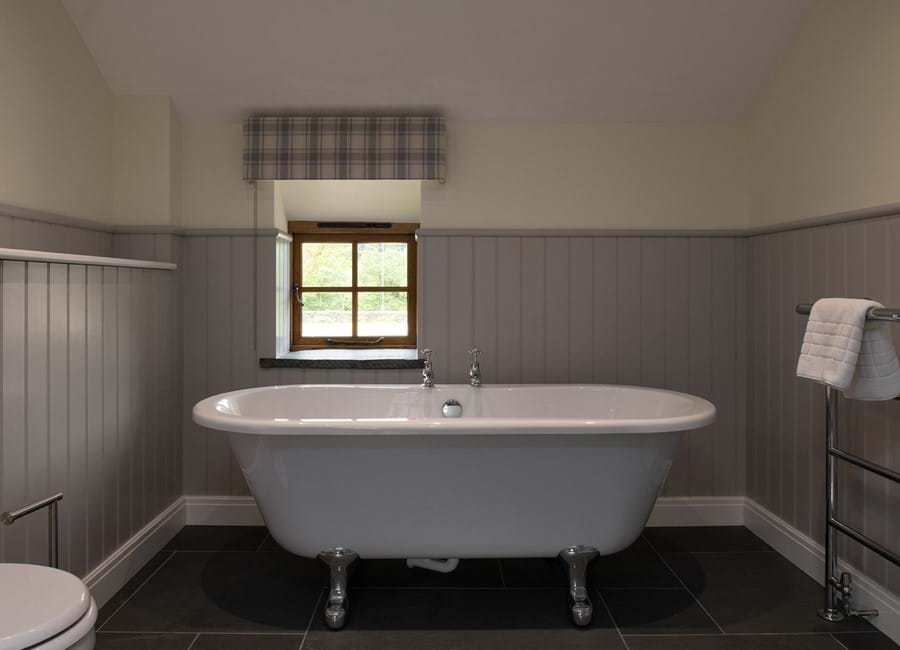 An oak staircase takes guests directly into the bedroom, which has a generous king-size bed, a smart TV and a spacious wardrobe with LED lighting. The adjacent en suite bathroom is spacious, housing both a roll-top bath and a large walk-in shower, combining functionality with sheer elegance.